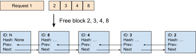 3. Allocate new blocks by popping the heads of the free queue. If the head block is a cached block, this also “evicts” the block so that no other requests can reuse it anymore from now on.